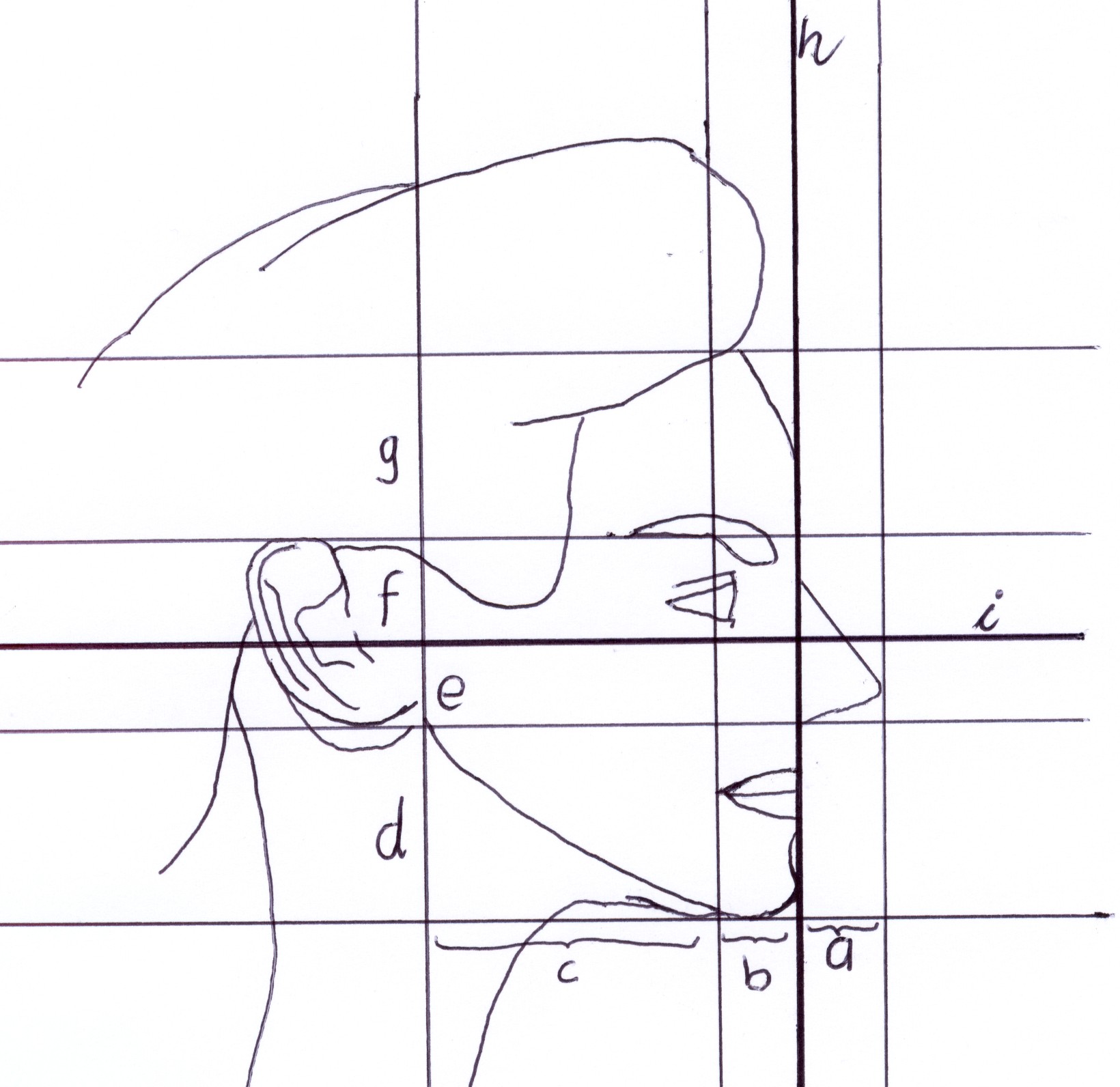 3. Profilgesetzmäßigkeiten Schon Leonardo da Vinci versuchte in Profilstudien des menschlichen Gesichts bestimmte Gesetzmäßigkeiten der unterschiedlichen Gesichtsproportionen aufzustellen. Bei obigen Bild sieht man zwei wichtige Linien: i = Frankfurter Linie h = Stirn - Kinn - Linie Des weiteren gelten folgende Proportionalitätsgesetze: a:b:c = 1:1:3,63 d:e:f:g = 2,3:1:1,2:2,2